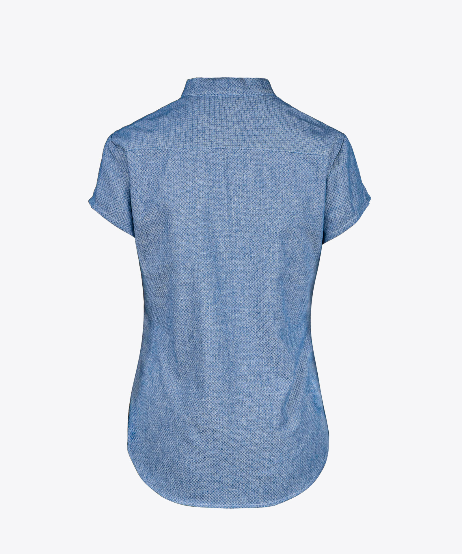 Kurzarm-Variante von Modell JOIS; Hanffaser-Qualität in Rautendesign; verkürzte Knopfleiste; gerundeter Saumabschluss; Damen mit kurzem Seitennahtschlitz und leichter Raffung an Schulternaht; Stehkragen