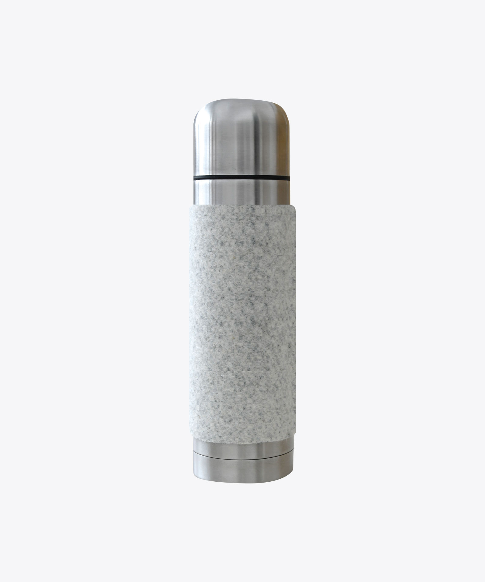 Thermosflasche mit Lodenstoffmantel; Schnellausguss per Knopfdruck und Trinkbecher; Handreinigung von Flasche empfohlen