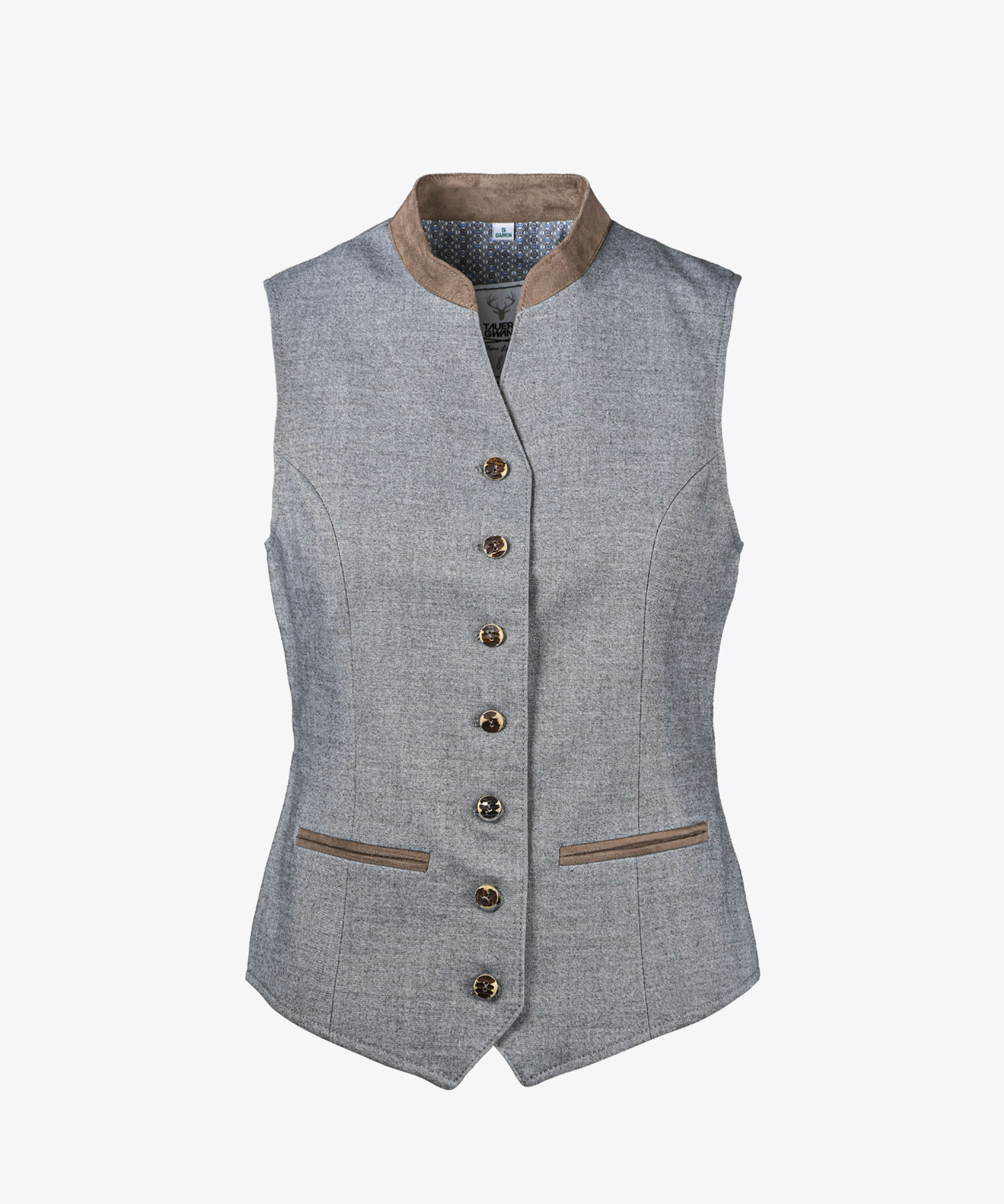 Weste in Woll-Look in Grau-Melange; kontrastfarbene Veloursstoff-Details; Rückenteil mit verstellbarem Rückenriegel; V-Ausschnitt mit kleinem Stehkragen; Beinknöpfe in Hirschhorn-Optik; Paspeltaschen; Innenfutter bedruckt