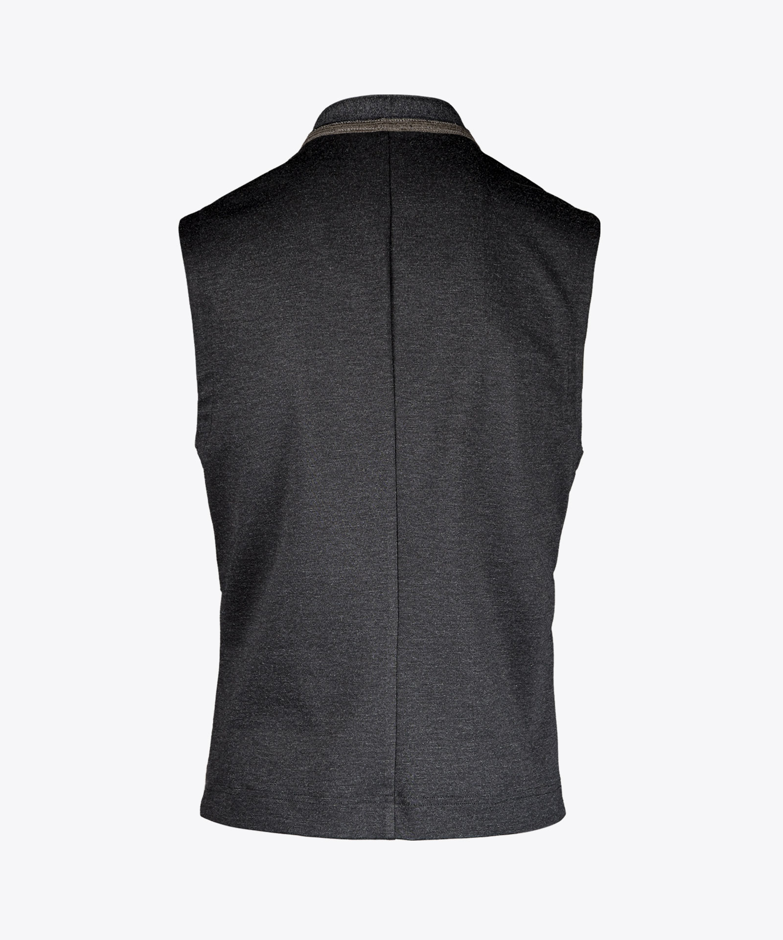 mit Innenseite Jersey-Bonding und hochelastischer Wirkware am Rücken; Lodenstoff-Akzente an Stehkragen außen und Tascheneingriffen; Wollbandeinfassung entlang vorderer Kante und Halsnaht; Knöpfe in Horn-Optik