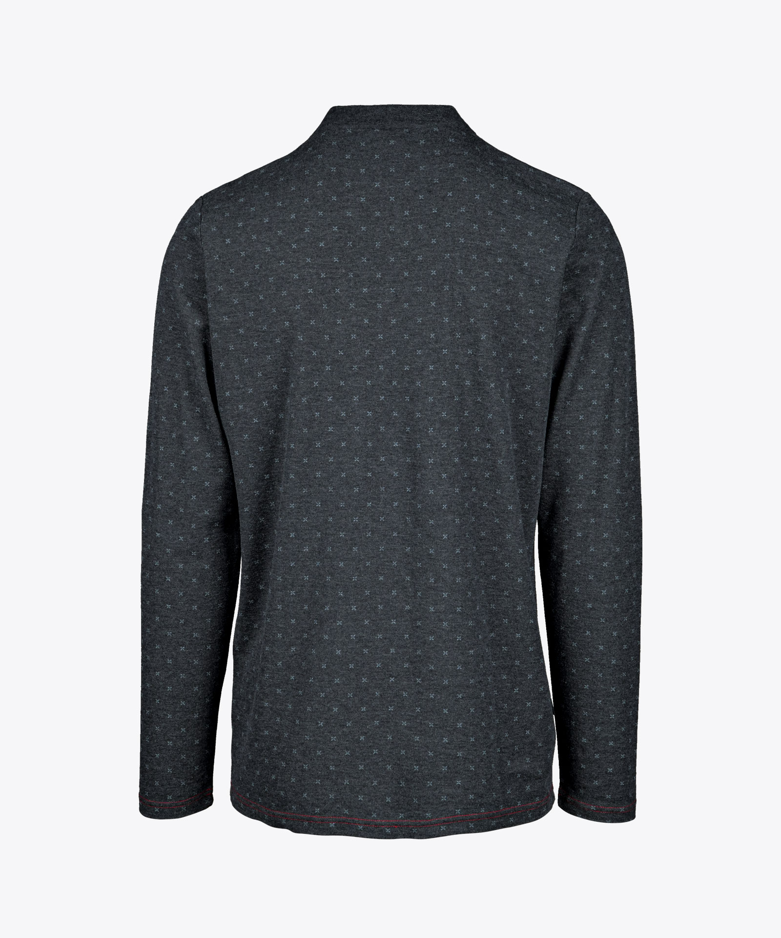 Feine Piquéqualität mit modischem Minimal-Print; Farbkontraste an Details; Dreiknopfleiste mit Metallknöpfen; Herren mit Stehkragen; Damen mit femininem V-Ausschnitt, offenem Stehkragen und gerundetem Saumabschluss