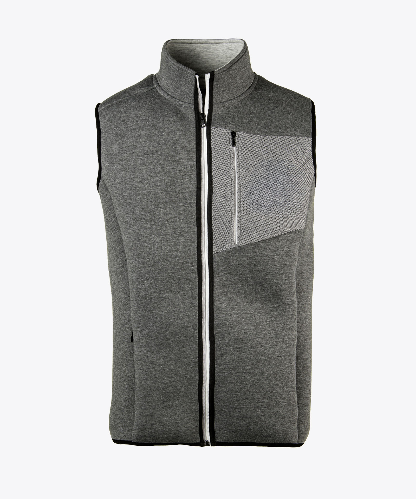 Einsatz an der Brust sind aus einem gestrickten Stoff welcher der Weste ein angenehmes Tragegefühl verleiht. Elastikeinfassung am Saum, Armloch und am Frontreißverschluss, , 2 Nahtzipptaschen, 1 Brusttaschenzipp,