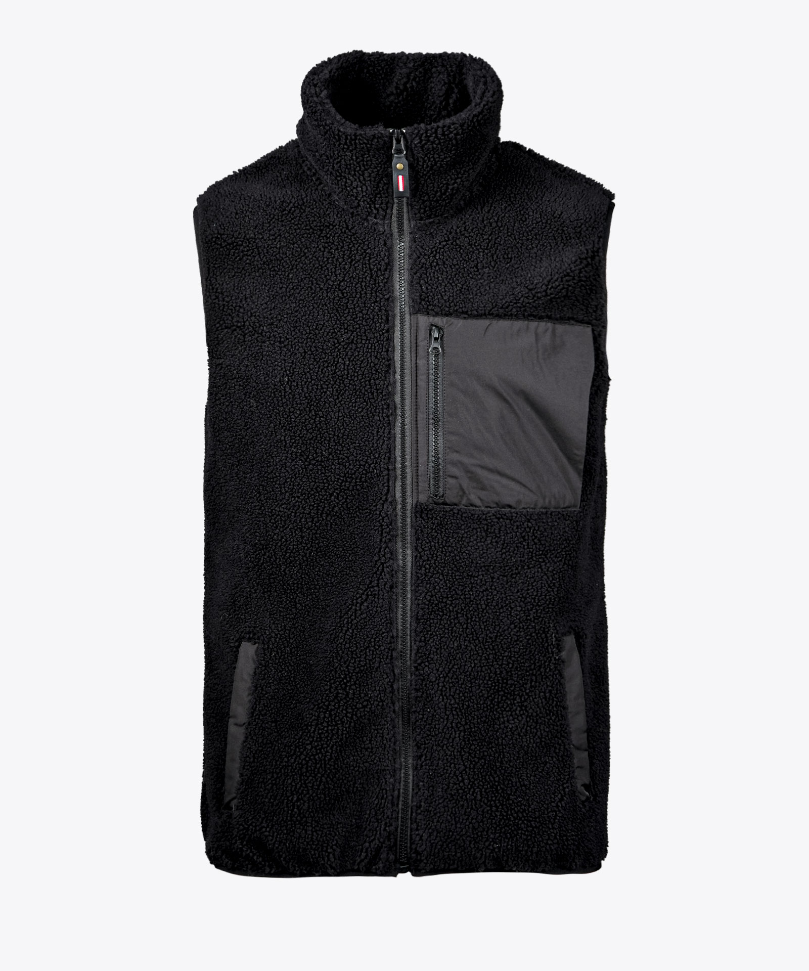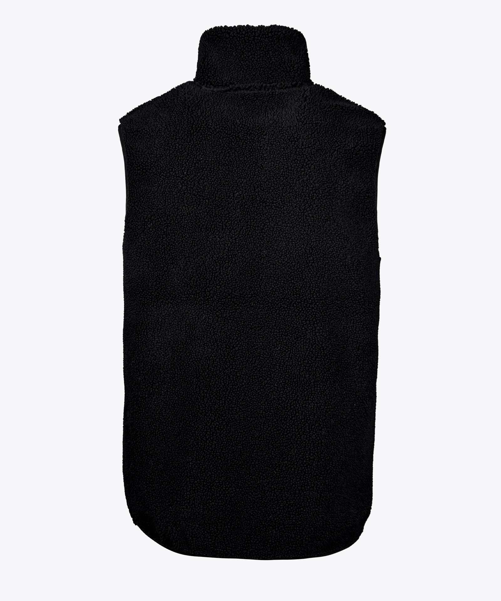 Weste aus doppellagigem Teddyfleece, Innenseite mit Jerseystoff gebondet; mit recyceltem Faseranteil; Kragen außen und innen in Teddyqualität; zwei seitliche Leisteneingrifftaschen; eine Brustzipptasche; Elastikeinfassung an Saum und Armabschluss
