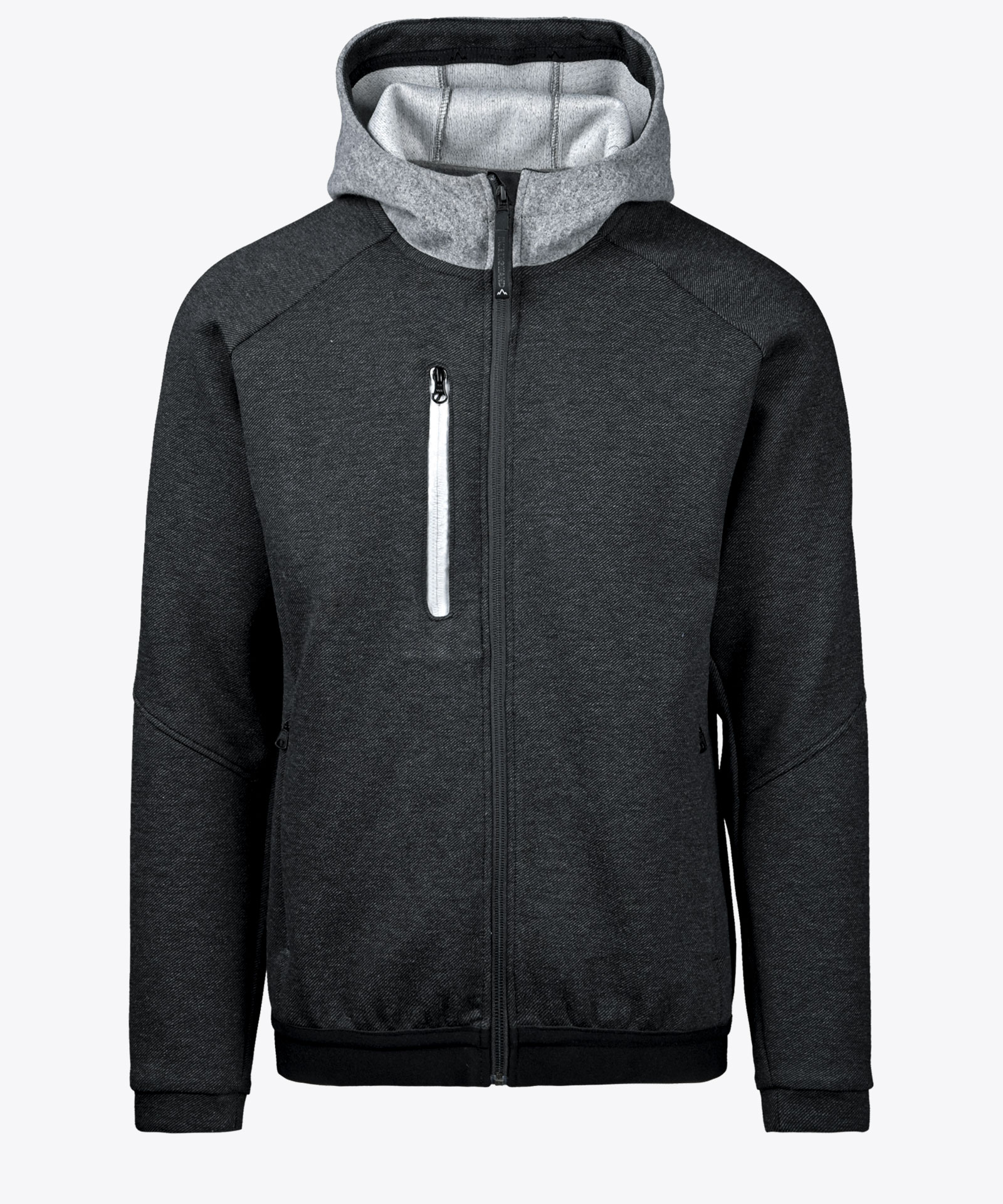 Zip-Hoodie mit Raglanärmeln aus unserer Tauerntex® -Multilayer-Technologie; doppelseitige Strickware in melierter Twill-Außenseite / Jersey-Rückseite; angeschnittene Kapuze in Kontrastmaterial mit Lodenstoffoptik; Zwei-Naht-Zipptaschen; Brusttasche mit kontrastfarbener Beschichtung für Laserlogo geeignet sowie an kurzer Kragenzippleiste mit Kinnschutzfunktion in Lederimitat; Saumabschluss mit Elastikbund und innenliegendem rutschhemmendem Silikonaufdruck; ungefüttert