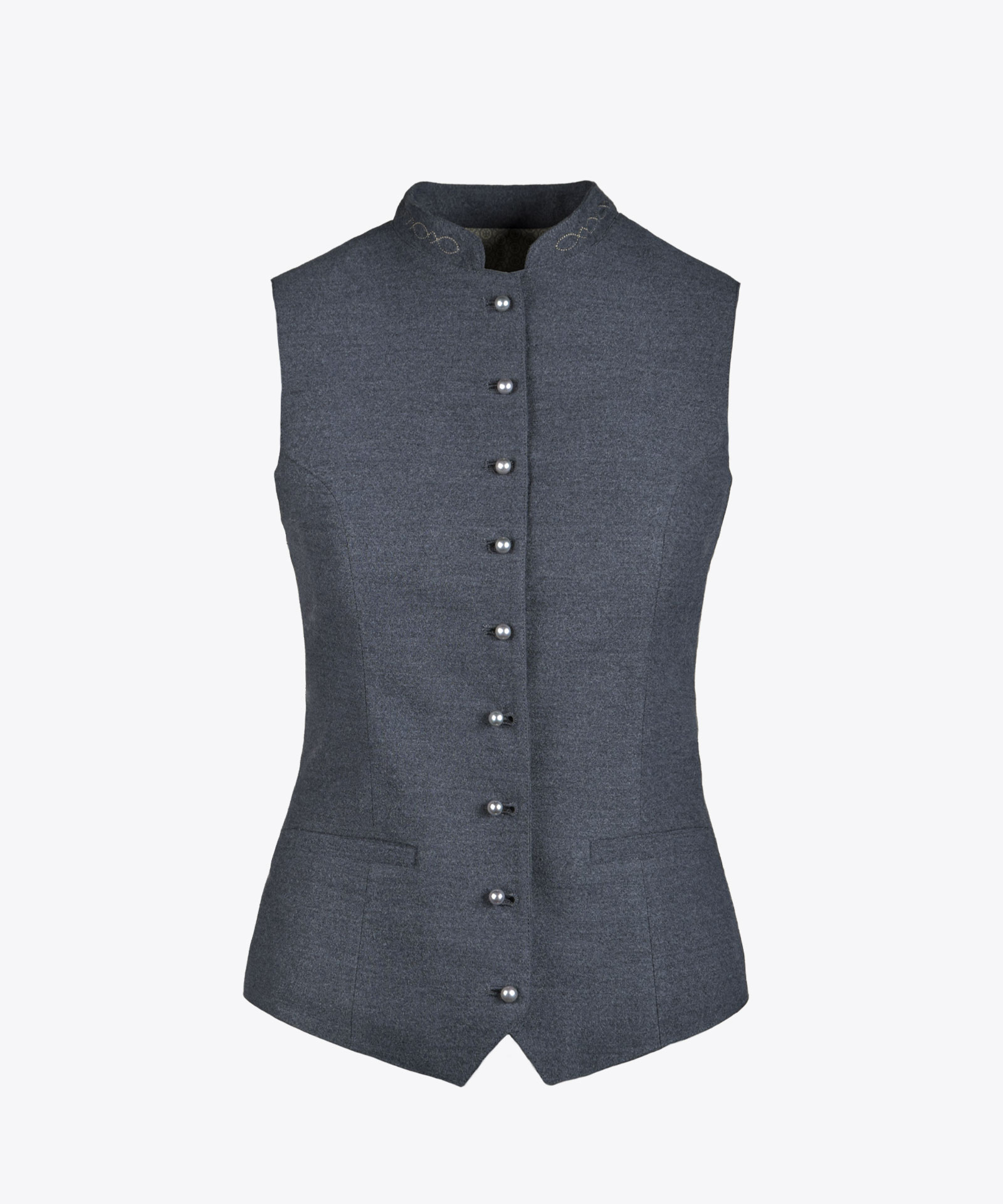 Hochgeschlossene Weste in meliertem Twillstoff mit Lodencharakter; pflegeleicht; Metallkugelknöpfe;