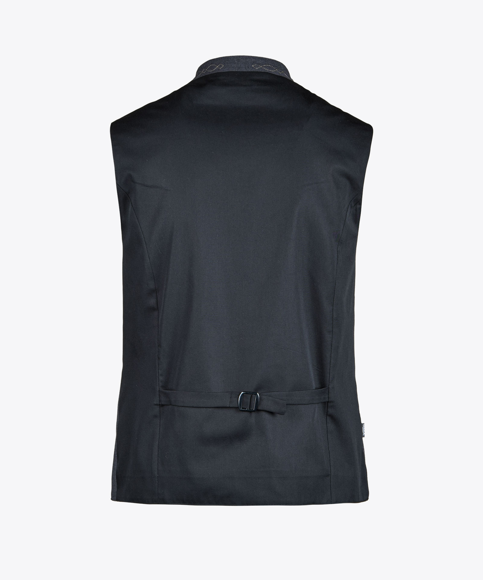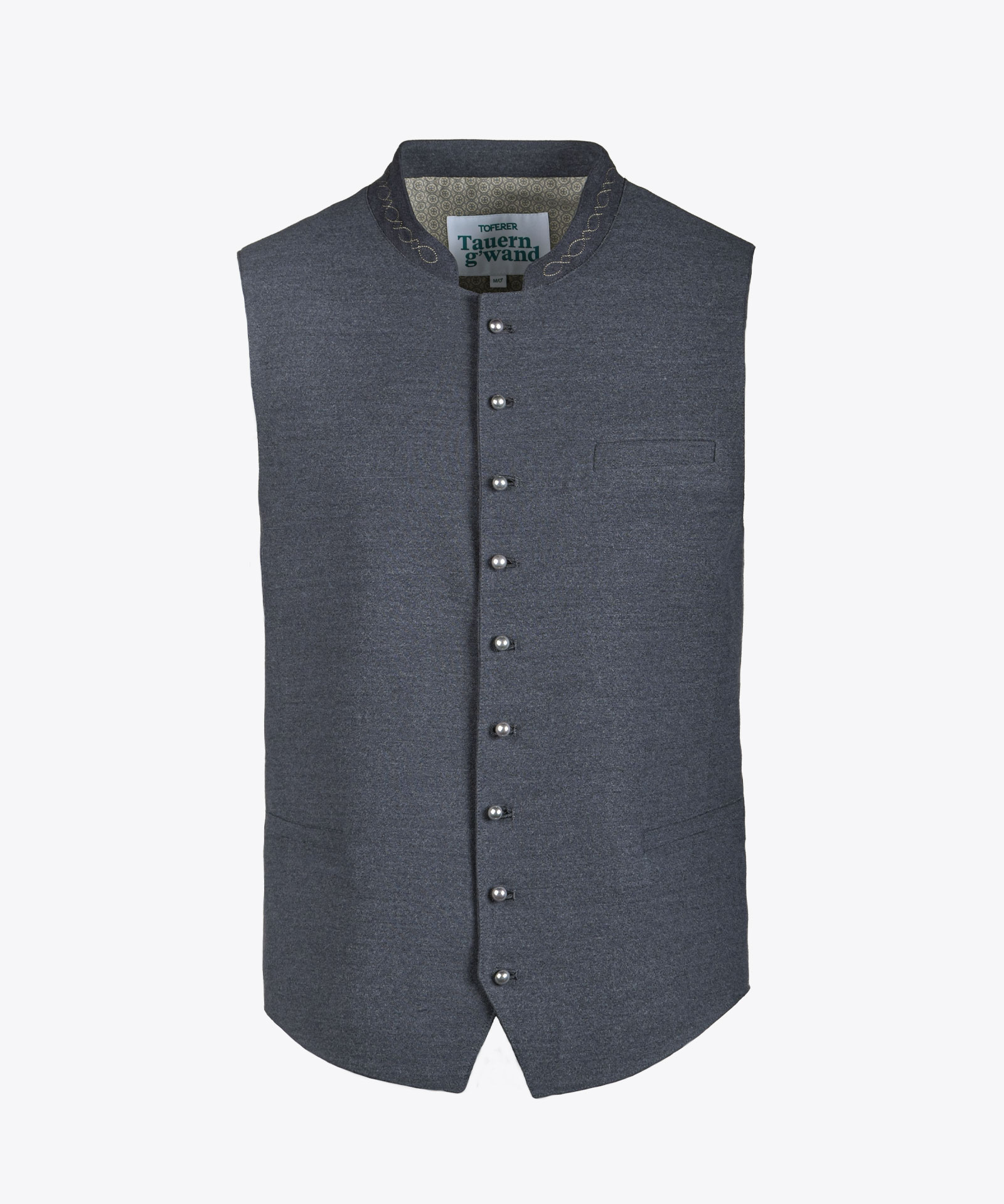 Hochgeschlossene Weste in meliertem Twillstoff mit Lodencharakter; pflegeleicht; Metallkugelknöpfe;